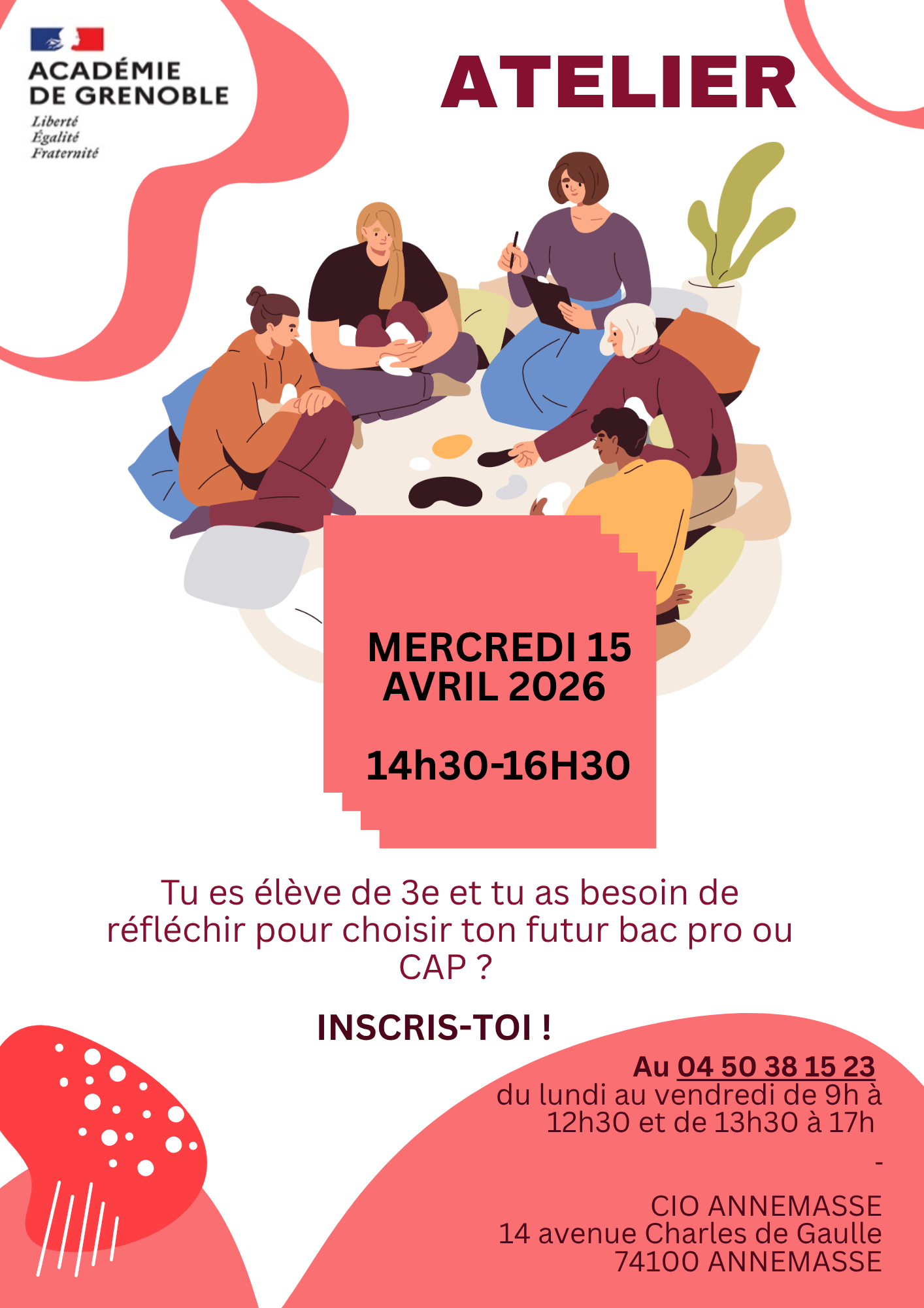 Le CIO d'Annemasse propose un atelier animé par deux Psychologues de l'Éducation Nationale au CIO d'Annemasse, intitulé "Orientation élèves de 3ème" :